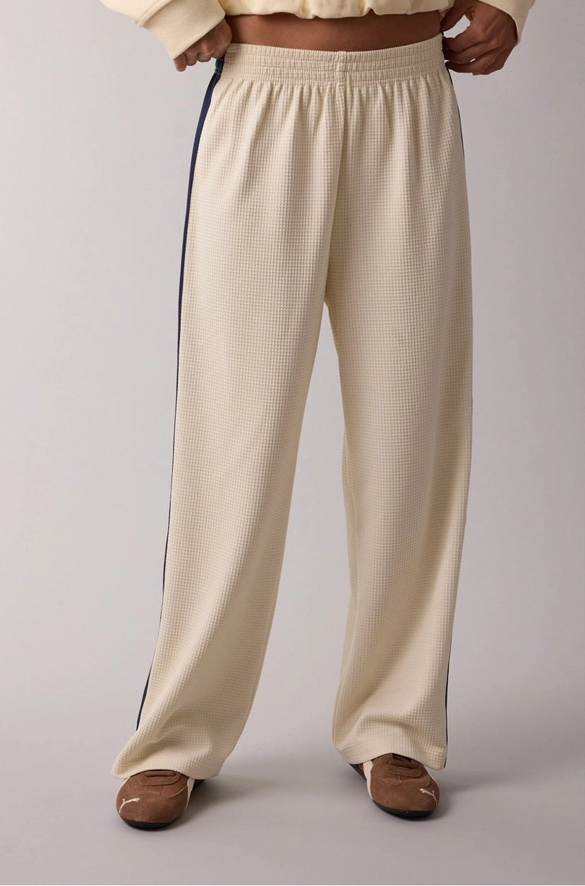 Crafted from premium waffle knit fabric, these pants deliver exceptional breathability and a refined texture that elevates everyday wear. The distinctive green side trim adds a sophisticated design detail that complements neutral bases while making a subtle style statement. The knit construction provides natural stretch and comfort for extended wear, making these an ideal choice for those who prioritize both aesthetics and functionality. Perfect for layering or wearing solo, these pants transition seamlessly from casual settings to more polished occasions.
