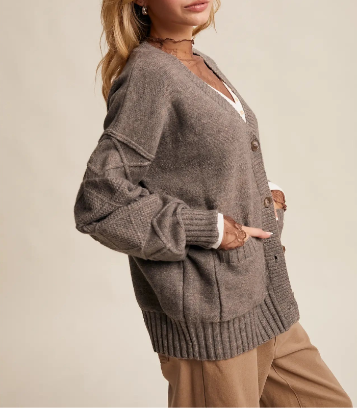 Expertly crafted from a textured knit material, the Brea Mocha Cardigan is a button-up style that exudes elegance and sophistication. With its rich and warm mocha color, this cardigan is the perfect addition to any wardrobe, offering both style and comfort.